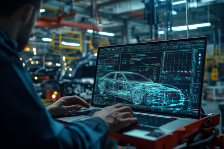 Automotive engineer using advanced technology in futuristic assembly line for car manufacturing
