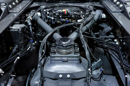 Engine V6. or VR6 engine compartment in dark colors. Under the car hood.