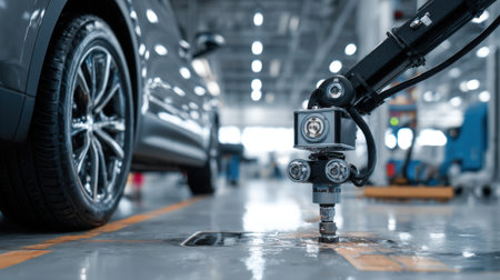 Focused shot of a smart robotic system calibrating sensors on a mixed fleet vehicle with the workshop environment gently blurred behind.