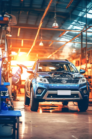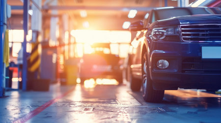 car service centre auto repair workshop blurred panoramic background. AI Generative