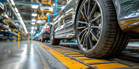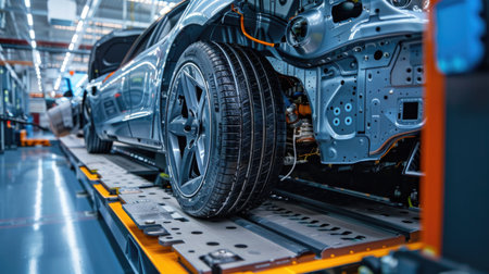 High-Performance Car Tire Being Mounted on Alloy Rim in an Automotive Assembly Line Setting. Concept Automotive Manufacturing, Alloy Rims, Tire Mounting, High-Performance Cars