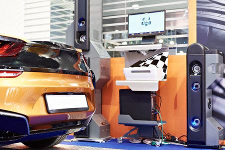 American SUV car on stand for wheels alignment camber check in workshop of service station.