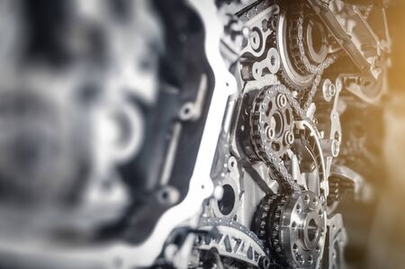 Close-up on a disassembled engine with a view of the gas distribution mechanism, chain, gears and tensioners during repair and restoration after a breakdown. Auto service industry.