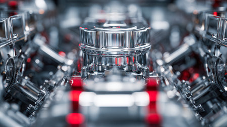 A close-up of a polished metallic machinery piece featuring complex assemblies and striking crimson accents, emphasizing precision engineering in a high-tech setup.