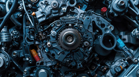 A detailed close-up image showcasing intricate mechanical engine parts, emphasizing metal textures and the complexity of modern technology in a dark environment.