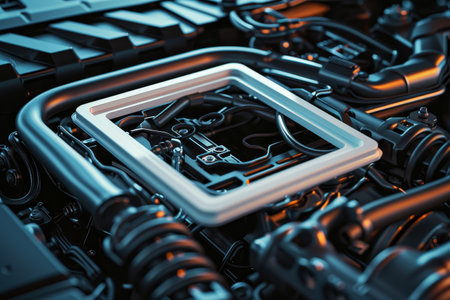 A detailed macro shot highlighting a gleaming engine's complex components, with woven hoses and precision-crafted metalwork reflecting cutting-edge engineering mastery.