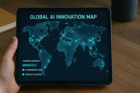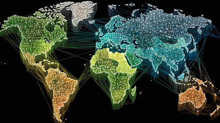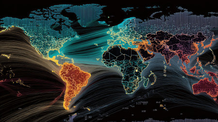 This vibrant abstract world map features colorful data flow representations, illustrating global connectivity and geographic patterns related to technology and communication.