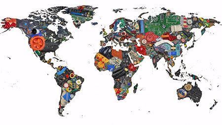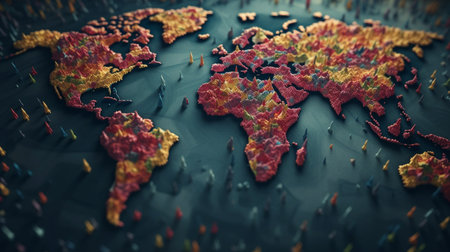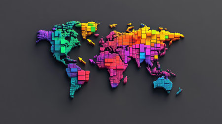 This representation of a global map features fragments highlighting continents like Africa and Europe with vibrant colors depicting different regions, illustrating geographical diversity.
