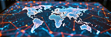 Digital world map with neon blue highlights and orange connections on dark background. That the image is generated using AI.