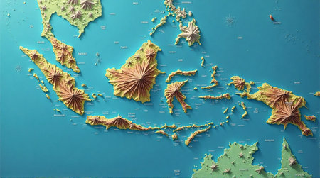 A detailed, 3D topographic map of the Indonesian archipelago, highlighting the diverse island formations and volcanic landscapes.