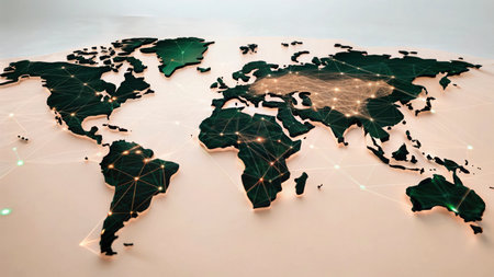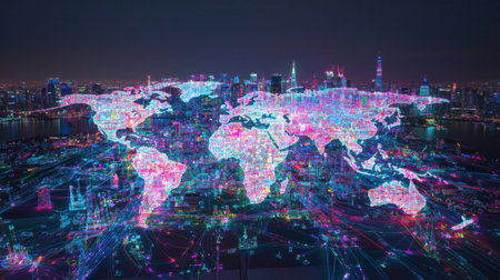 Neon-lit world political map with vibrant trade routes linking continents, showcasing global commerce and the interconnected nature of the world.