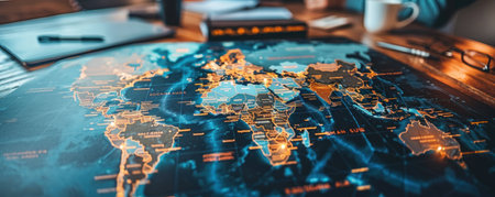 Strategic planning meeting with a global real estate map investment flows connecting cities
