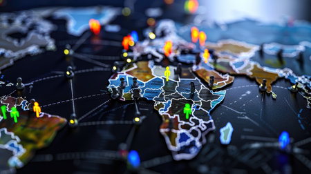 Digital illustration of global team connections, outsourcing, HR, and tech strategy network