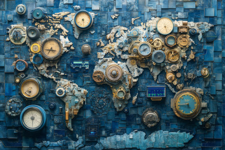 Weather data is transformed into a unique map, featuring various clocks and gears, illustrating a blend of art and geography. The diverse colors and textures enhance its visual appeal.