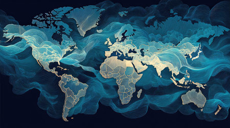 This abstract digital illustration features a world map design with flowing lines and fluid patterns, showcasing beautiful shades of blue and light colors. Ideal for concepts of geography and global connectivity.