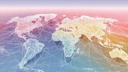 This abstract illustration depicts a colorful world map with intricate network connections, symbolizing global communication and interconnectedness.