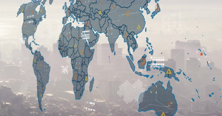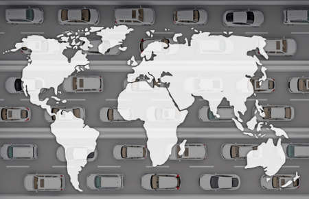 Data processing over world map against city traffic. Global networking and business data technology concept