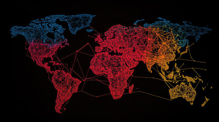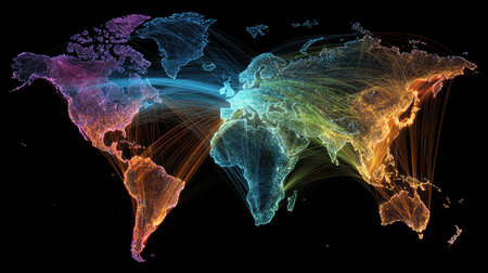 Stunning map visualization showcasing a colorful network of connections across the globe, representing trade and communication routes in a vibrant and modern design.