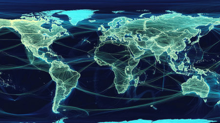 This stunning illustration depicts a world map with luminous light trails symbolizing global connectivity and communication, highlighting the intricate network of trade and information flow.