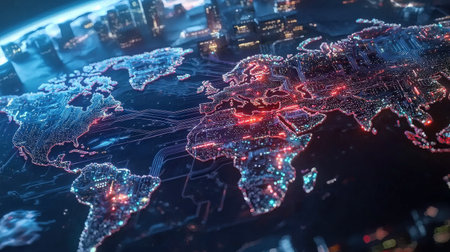 This vibrant global network map showcases illuminated connections between continents, emphasizing the role of technology in data transfer and international relationships.