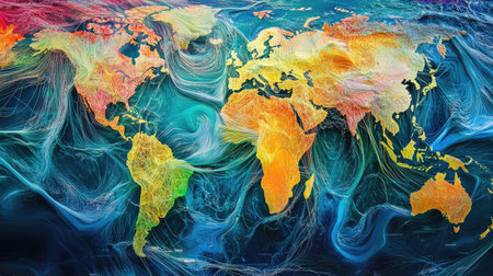 An abstract world map featuring vibrant flowing lines and colors, representing global connectivity. Perfect for visualizing geography or concepts in education.