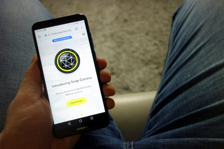 KONSKIE, POLAND - February 08, 2019: Man holding Huawei smartphone with Snapchat website displayed. Social media concept