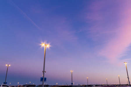 Large car park. There are few cars on it, a lot of free parking spaces. Aerial photography.