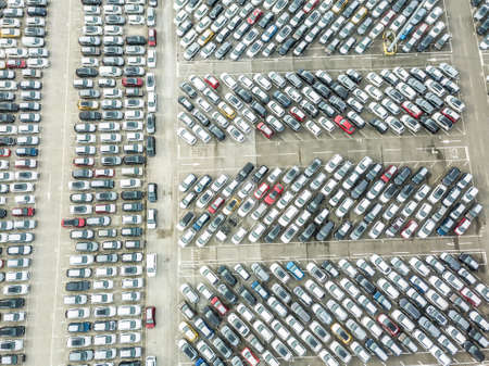 Aerial drone view of Parking lot. New cars storage area. Many cars parked in a rows and ready for sale and distribution.
