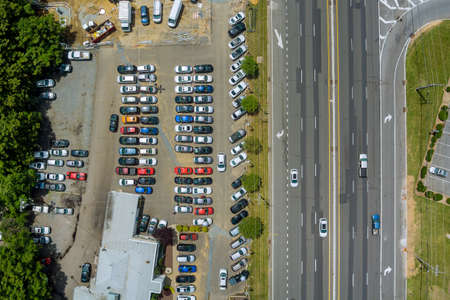 Aerial view of auction reseller company big parking lot with parked cars ready for remarketing services. Sales of secondhand vehicles