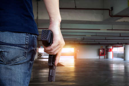 A man holding a gun in hand. - violence and crime concept.