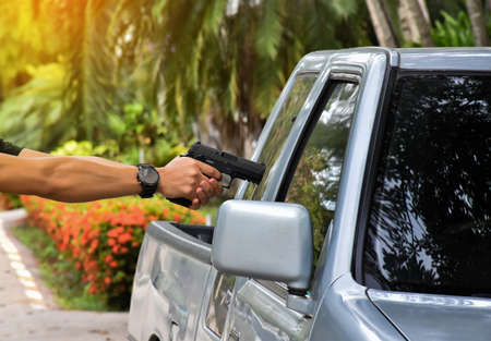 Robber with a gun robbing intimidate.Crime and robbery concept.