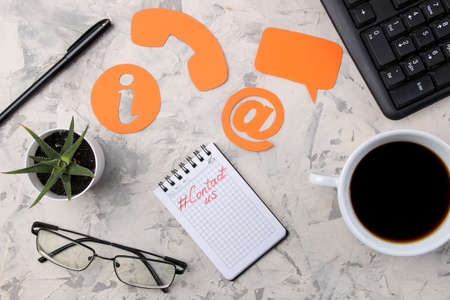 client support service. Contact us for feedback. Desktop with notepad and glasses and various feedback icons. top view