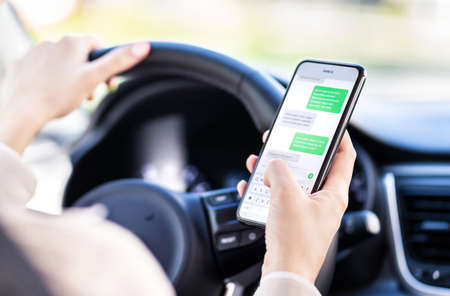 Driving car and using phone. Distracted driver texting with mobile cellphone. Irresponsible woman checking sms message with smartphone in traffic. Auto accident concept. Holding smart device in hand.