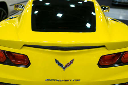 Sankt-Petersburg, Russia, July 21, 2017: Back view of a yellow Chevrolet Corvette Z06. Car exterior details. Photo Taken on Royal Auto Show July 21