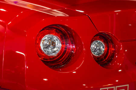 Back part of the red automobile at an exhibition