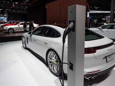 New York, US - March 28, 2018: Porsche Panamera 4 e-hybrid on display during the 2018 New York International Auto Show held at the Jacob K. Javits Convention Center.