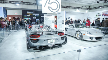 Crowds looking at new car models at Auto show. Porsche Spyder car on display. National Canadian Auto Show with many car brands. Toronto ON Canada Feb 19, 2023
