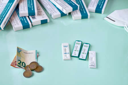 Cost of shnelltest, express corona test in German. Packed Covid 19 antigen tests, money, weekly planner, masks. Days of the week, on planner are written in German.