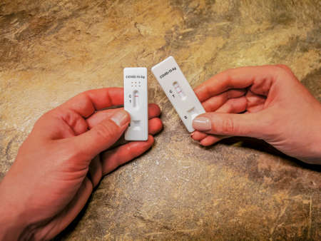 Two antigen rapid test devices for coronavirus covid-19 shows positive and negative result