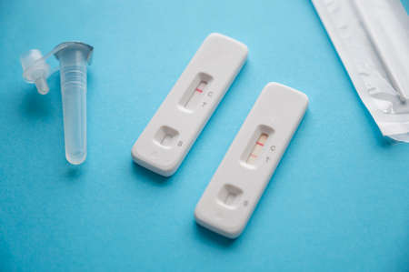 Coronavirus antigen test with negative and positive result on a blue background. Copy space for text