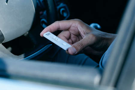 closeup of a young man, in a casual wear, looking to an antigen diagnostic test device, waiting for the results, while is sitting in the driver seat of his car