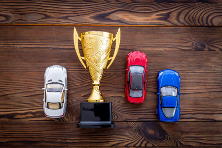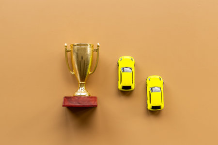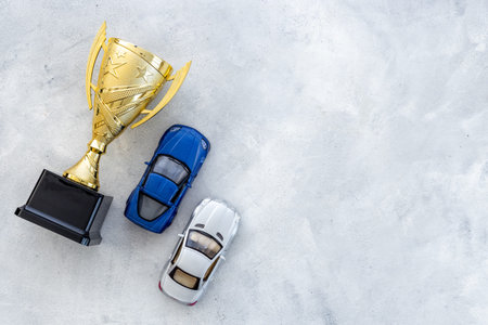 Award golden trophy cup with car models as a symbol of victory. Winning the competition concept.