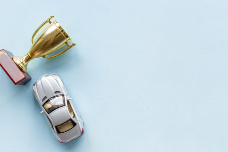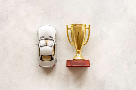 Champion golden trophy cup with car model. First place winning the competition concept.