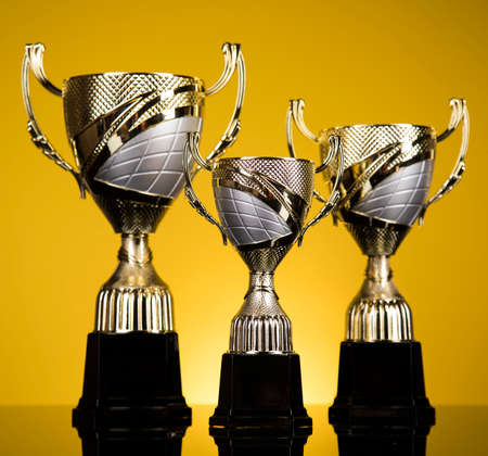 Golden trophy on yellow background.Concept championship.