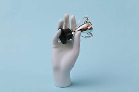 White hand of a mannequin holds the championship cup on a blue background. Sport, champion concept.