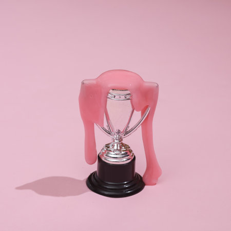 Creative layout, winner cup with slime on pink background with shadow. visual trend. fresh ideas. concept pop