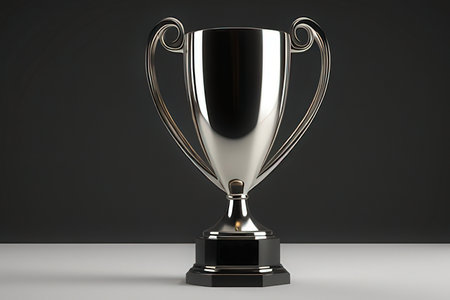 Close-up of champion silver trophy on grey background