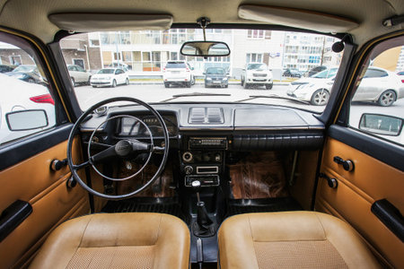 Novyy Urengoy, Russia - June 5, 2021: Interior of the Soviet retro car Izh Moskvitch 412.