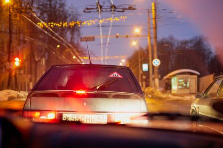Kirov, Russia - December 30, 2017: Car in the night city. Colorful night traffic. Evening city with traffic lights in Russia