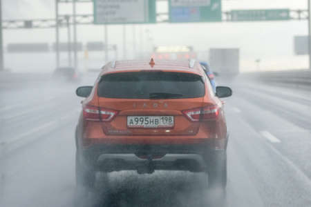 Russia, St. Petersburg, August 26, 2020: traffic on the bypass road during the rain. Bad weather and driving.